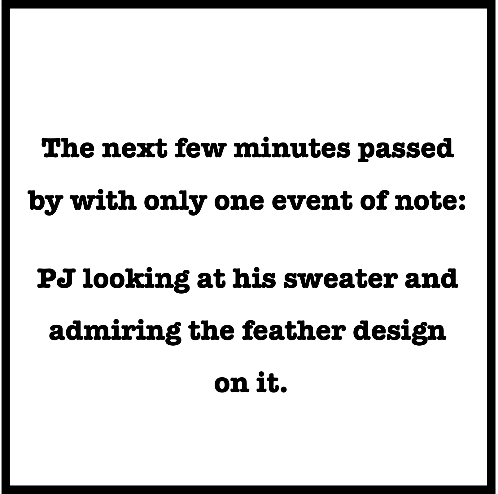 The next few minutes passed by with only one event of note: PJ looking at his sweater and admiring the feather design on it. He shared a remark about how he did such a great job in finding a nice, breathable fabric for his writing outfit.